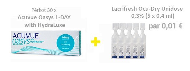 Купите 30 шт. или более контактных линз Acuvue Oasys 1-DAY with HydraLuxe и получите глазные капли Lacrifresh Ocu-Dry Unidose 0,3 % (5 x 0.4 ml) всего за 0,02 €!